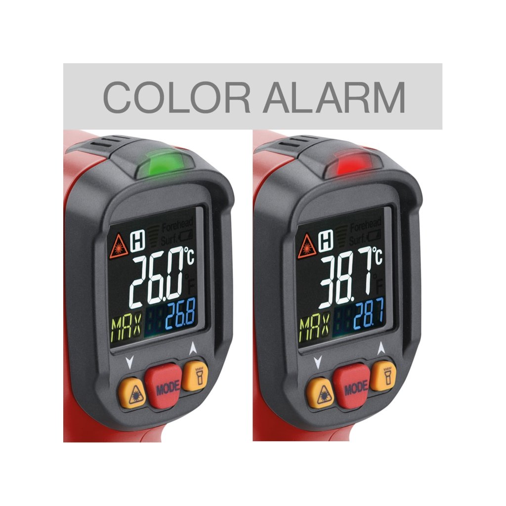 - světelná, barevná indikace při kontrolním měření libovolně nastavené teploty. Lze nastavit indikaci pokud je teplota pod/nebo nad zvolenou hodnotou
