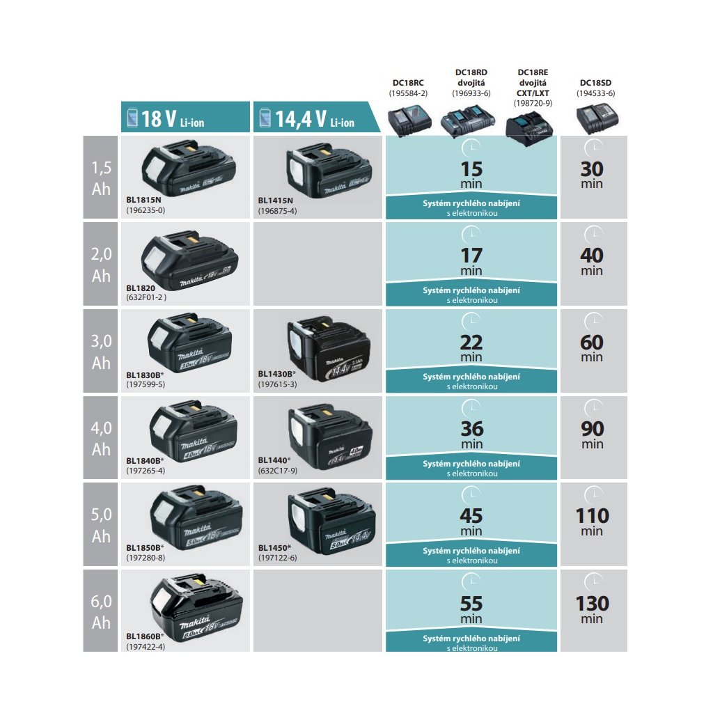 Rychlonabíječka DC18RC (195584-2) je vhodná pro baterie řady LXT s 14,4 V a 18 V. Díky chladicímu systému je baterie během nabíjení chlazena, aby bylo dosaženo rychlého nabití a zlepšení výkonu. Po úspěšném nabíjení zazní volitelná melodie, kterou lze přizpůsobit.Doplňkové parametry