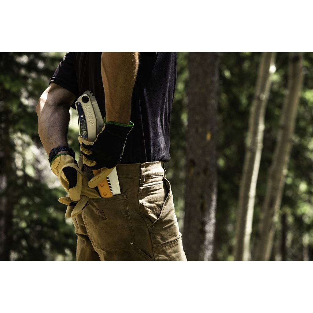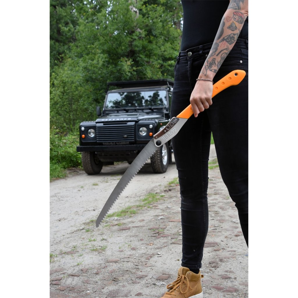 Pilu lze jednoduše složit a rozložit pomocí aretačního tlačítka, které zároveň dovoluje uživateli nastavit 2 různé polohy řezání. Gumová rukojeť pak zajišťuje bezpečný a pohodlný úchop a je dostatečně velká na to, abyste jste mohli pilu používat oběma rukama. Pro větší praktičnost je v rukojeti přítomen otvor, který umožňuje k pile připevnit karabinu nebo lano.