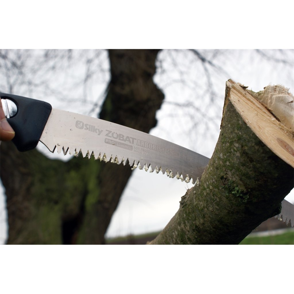 Zübat je k dispozici v různých délkách čepele. Velmi oblíbený je model Zübat 330, který zvládne silné větve o průměru až 17 cm. Tento model je také k dispozici s jemnějšími zuby o počtu 10 na 3 cm a poznáte ho podle stříbrně zbarvených šroubů. Speciální model Zübat Arborist má konfiguraci zubů s extra velkými zuby pro ještě rychlejší řezání v čerstvém dřevě. Stejně jako každá jiná pila od Silky zůstanou zuby ostré i při častém intenzivním používání a zanechají za sebou vždy hladký řez. Zübat Arborist poznáte podle světle chromových šroubů na gumové rukojeti GOM.